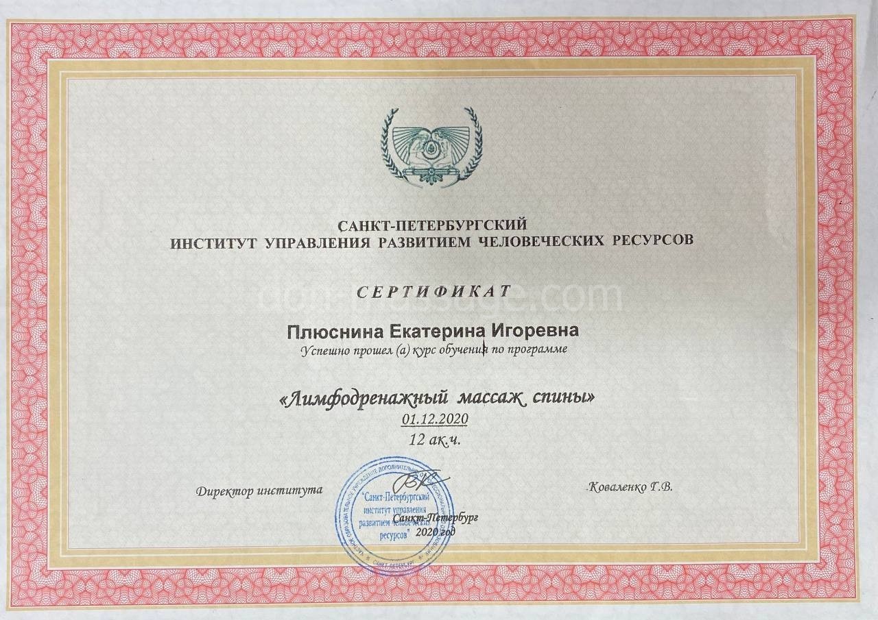 Меня зовут Екатерина и я профессиональный массажист, телесно-ориентированный практик. Имею медицинское образование, сертификат специалиста государственного образца, опыт работы более 5 лет.